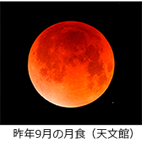 星空情報【ひなまつりの夜に皆既月食を楽しもう】 来月の初め、3月3日、ひな祭りの夜に皆既月食があります。月食とは、太陽と月(満月)、そして地球が一直線に並ぶ時に起きる現象です。 太陽の光を受けて明るく輝いている地球は、反対側に影を作ります。そこに月が入ってくることで月表面に暗い影ができるのです。それが月食です。 月食には月の一部だけが暗くなる”部分月食”と、全部が暗くなる”皆既月食”とがあり、今回は皆既月食となります。19時頃から部分食が始まり、20時過ぎには皆既食となります。食が完全に終わるまでに3時間以上の天体イベントが楽しめます。 普段は月明かりがあると夜空の星は見にくくなりますが、月食の時にはたくさんの星が輝いて見えるようになります。さらに皆既食の時だけに見られる赤銅色の月も期待できます。 天文館でも観望会を実施しますのでぜひおいでください。 |